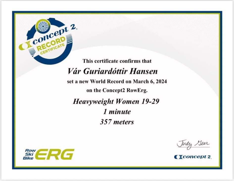 At føroyskir rógvarar eru heimsins bestu er enn einaferð staðfest, nú Vár Guriardóttir Hansen hevur sett nýtt heimsmet á 1 min í bólkinum 19-29 ár tungvekt.