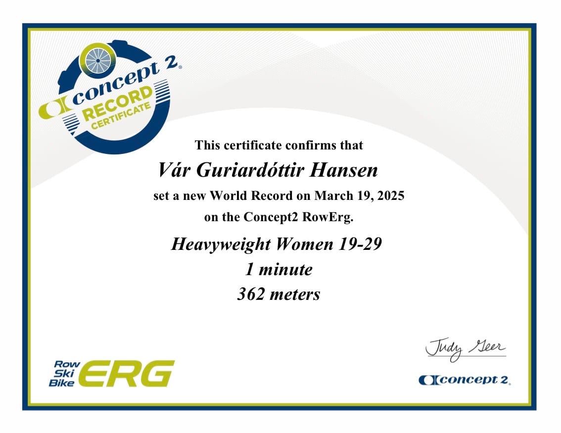 Vár Guriardóttir Hansen, næstforkvinnan í RSF, tók í mars 2024 heimsmetiđ á 1 min í bólkinum 19-29 ár tungvekt. Fyrr í vikuni betrađi Vár um sítt egna heimsmet, tá hon róđi 362 metrar uppá 1min, tađ eru 5 metrar longur enn gamla metiđ.